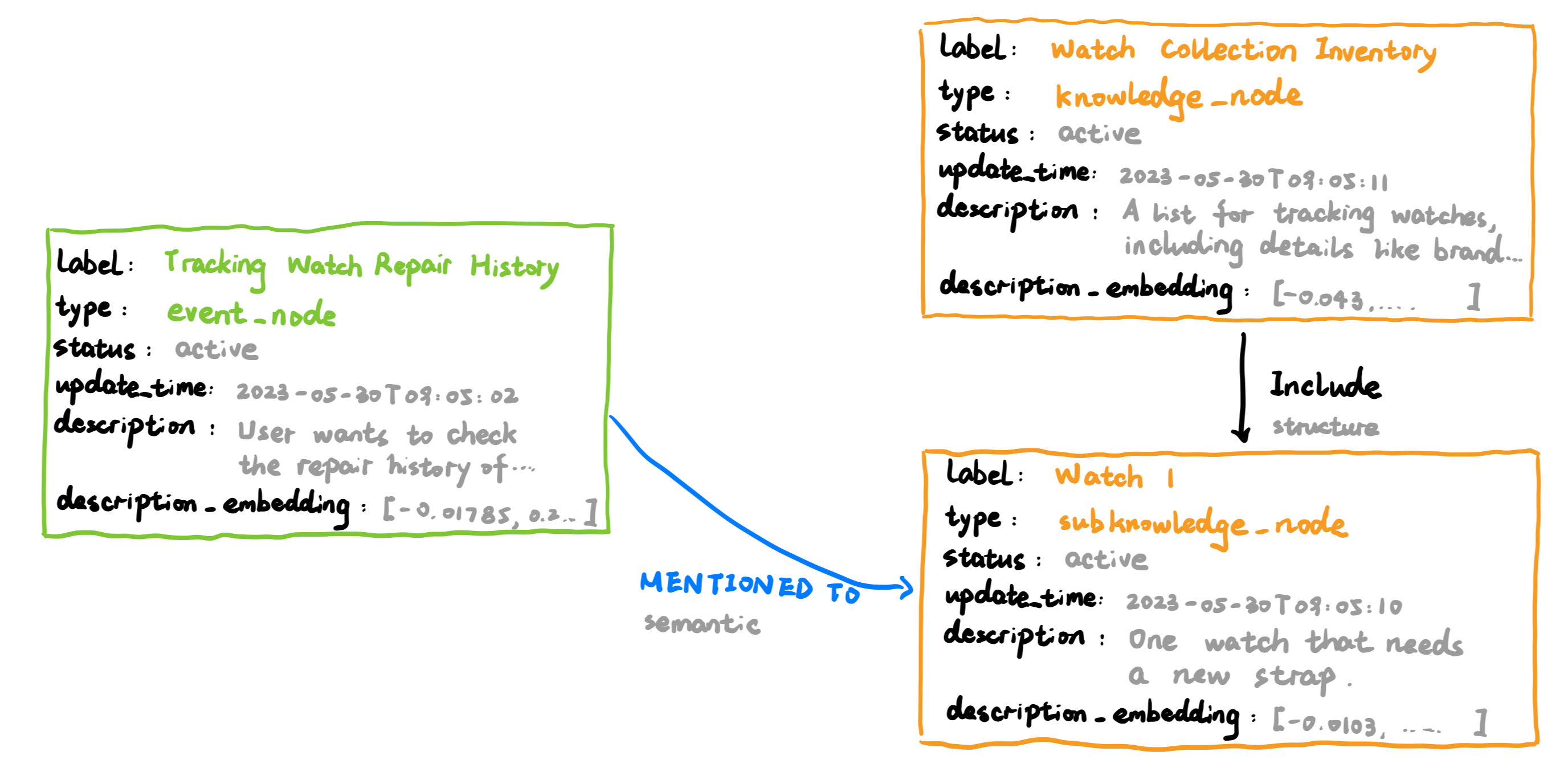 label: The human-readable meaning of the relationship (e.g.,HAS_GOAL,REFERENCES_KNOWLEDGE,PRECEDES).type: The category of the relationship:structural: Defines the graph’s organizational backbone.semantic: Represents meaningful connections between entities.